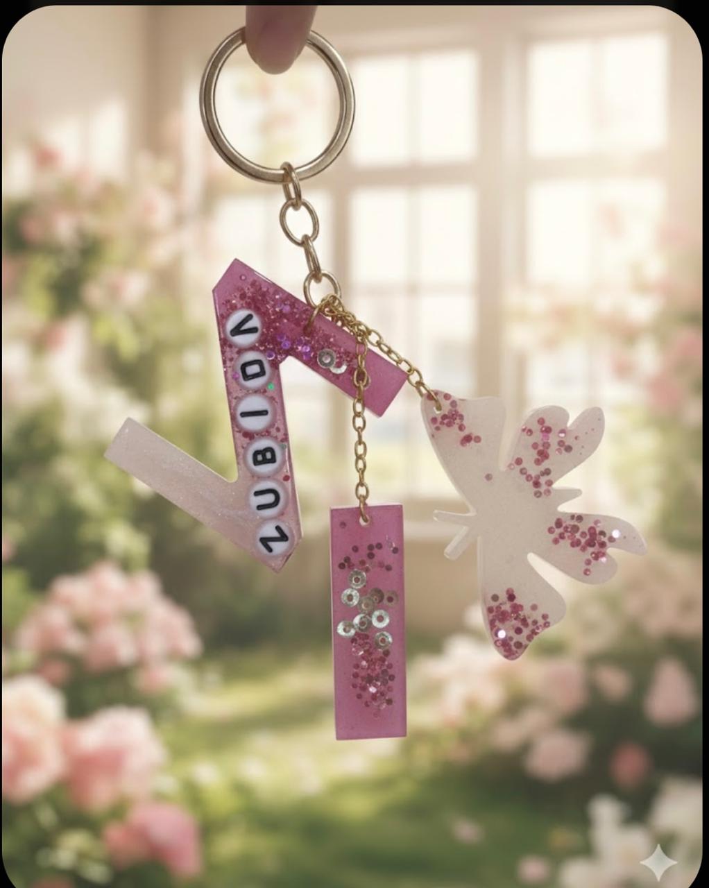 Make your accessories uniquely yours with this personalized resin letter keychain. Crafted with shimmering glitter details and stylish charms, it features custom name letters for a personal touch. Lightweight, durable, and perfect for keys, bags, or gifting someone special.